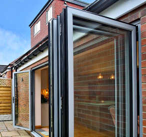 Our popular ultra-energy efficient bifold PURe® Aluminium doors in Glacial Spark