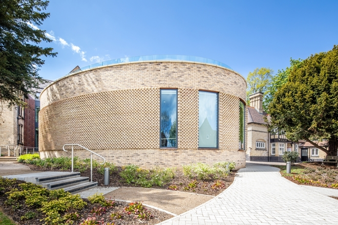 The elliptical Harvard-style lecture theatre, added more complexity to the build, and careful calculations were required to enable the curved windows to be set out correctly.