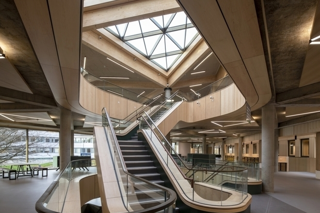 Inspiration for the new build was taken from both the brutalist architecture of the adjacent buildings and the University’s breath-taking location next to loch Airthrey with the Ochil and Campsie Hills to either side, and the distinctive Castle and Monument on the horizon. The approach from the loch side is spectacular, with dramatic top lit voids which bring daylight into the heart of the building, whilst inside a sculpted staircase creates a fascinating focal point. To integrate seamlessly with the surrounding landscape, the exterior of the building was finished in granite rainscreen and light grey stone cladding with curtain wall glazing to make the most of the spectacular views from all three levels.