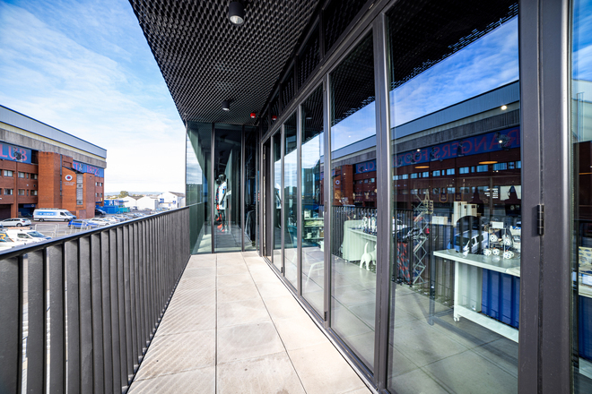The entrance to the building is via Record UK’s FTA20 automatic bi-folding door system, which is one of our supply chain partners that we have worked with on several projects. Another key feature of the building’s design is an industrial sliding door that blends into the façade when not in use but which can be fully opened to create a sheltered fan zone area on match days.