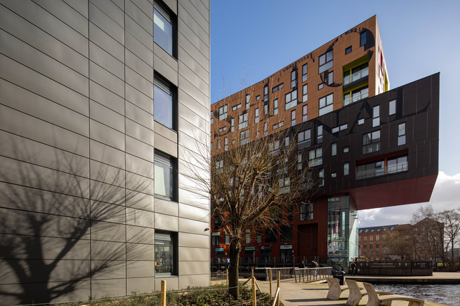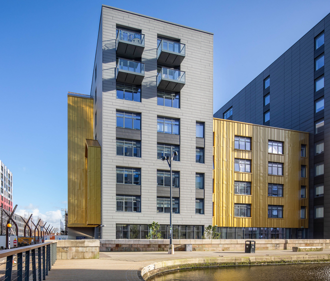 The development’s low pitch sawtooth roof design pays homage the area’s industrial heritage, with the slim aluminium frames of the fenestration package further complementing the main façade of zinc cladding, brick and coloured panels. Initially designed by CallisonRTKL, the Lampwick Quay development was delivered by jmarchitects.