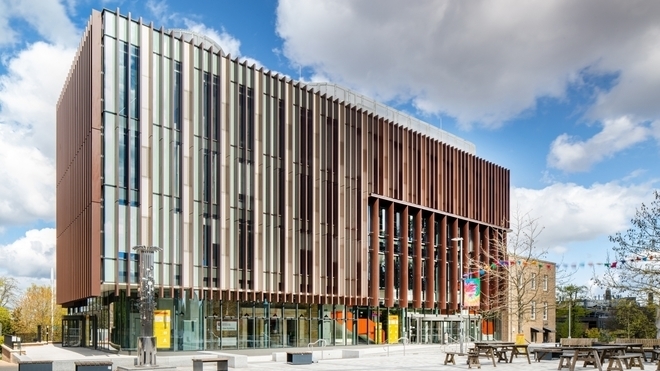 The building’s WOW factor comes in the shape of the new eastern façade of the four-storey extension which fronts directly onto the recently completed Fielding Johnson Square.
