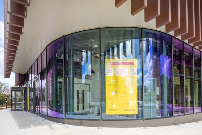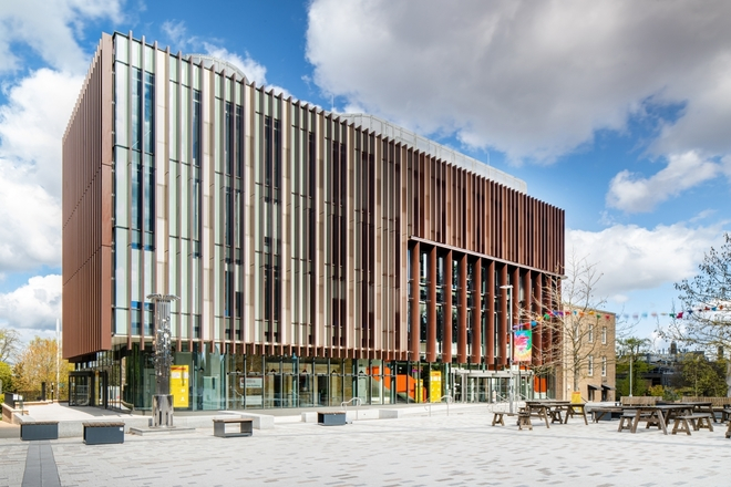 The building’s WOW factor comes in the shape of the new eastern façade of the four-storey extension which fronts directly onto the recently completed Fielding Johnson Square.