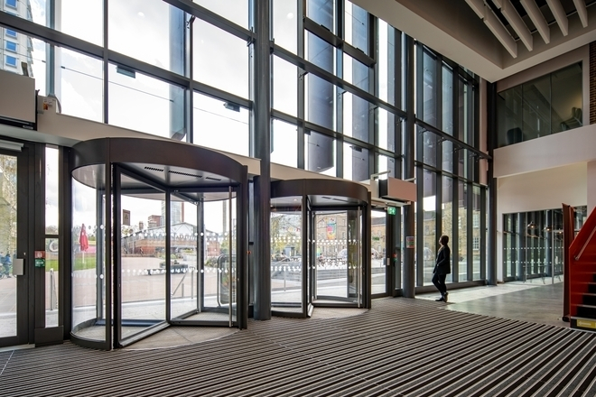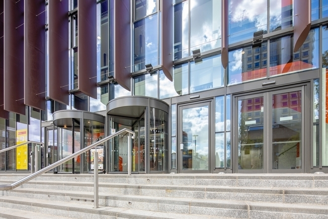 Curved glazing and eye-catching perforated panels add to the dramatic appearance of the façade. For the main entrance, Seniors robust SPW501 Commercial Doors were chosen to cope with expected heavy footfall. The overall effect is a stunning entrance and façade to a spectacular building.