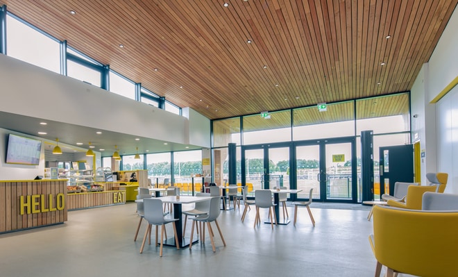 The single-storey building has been designed to be sympathetic to the surrounding landscape and importantly, not interfere with the flight path of the nearby Norwich International Airport. Externally, the building’s dark undulating roof and attractive wood cladding are complemented by the slim frames of the fenestration systems, which have been powder-coated and further accentuated by the use of ‘canary’ yellow detailing around the openings. These pops of colour, which are also used in the signage, pay homage to the team colours of Norwich City FC, with the facility itself named The Nest in honour of the club’s famous former ground.
