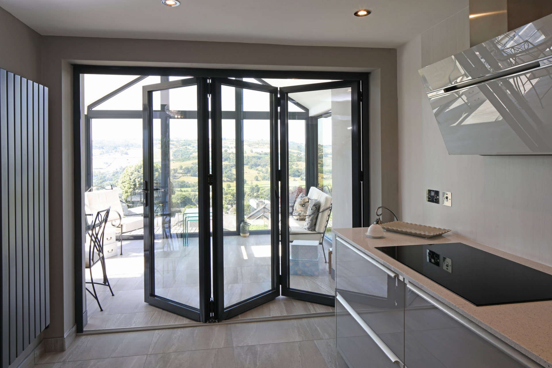 A recent contract completed by West Yorkshire Windows has seen Senior’s Ali FOLD folding sliding doors used as part of an attractive residential kitchen extension and conservatory project in Derbyshire. The high performance aluminium doors have been installed internally, to give access from the kitchen to the conservatory, with another set of Ali FOLD doors opening up into the garden.