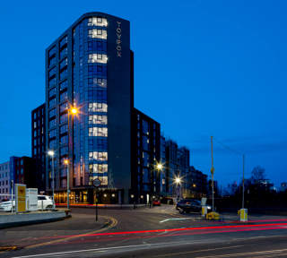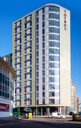 Located in the heart of the city centre, The Toybox offers luxury student accommodation over 15-storeys and has been designed by Corstorphine + Wright architects. The building’s eye-catching curved façade, which creates a cantilevered canopy over the main entrance, features an attractive mix of green coloured brickwork, zinc cladding and the extensive use of Senior’s slim-profile aluminium glazing.