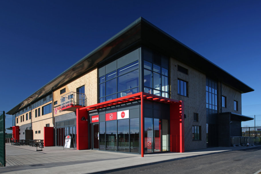 A winning team of products from Senior Architectural Systems, including the new thermally efficient PURe® aluminium window system and SF52 aluminium curtain walling, has been installed by Anders Glass as part of the ambitious redevelopment of the training ground at Fleetwood Town Football Club in Lancashire.