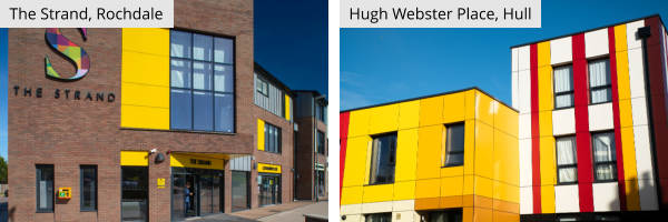 The Strand in Rochdale, a mixed retail and residential development also makes good use of yellow, providing a zingy splash of colour next to the anthracite grey of Senior’s SPW501 commercial aluminium doors and SF52 aluminium curtain walling.